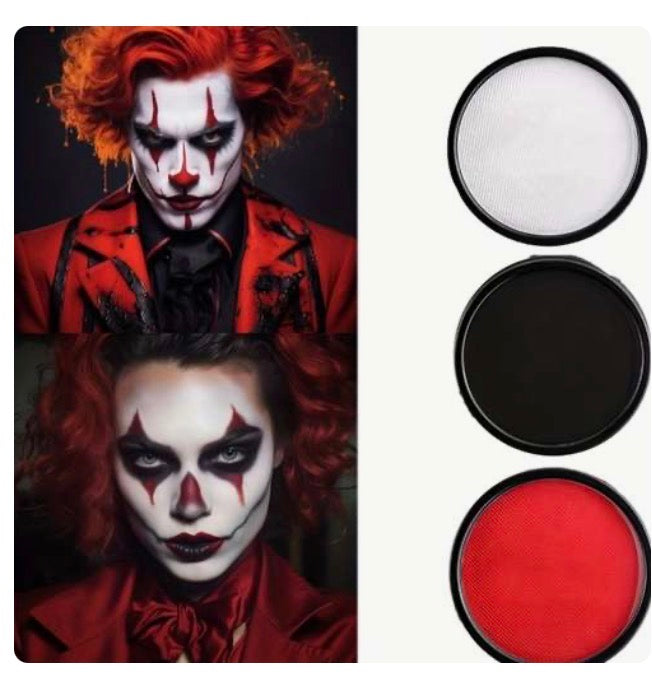 Crea los looks más impactantes este Halloween con nuestro kit de pintura facial en rojo, negro y blanco, inspirado en maquillajes artísticos de terror y fantasía 🎭.