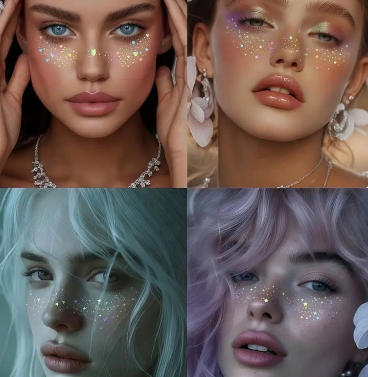 Puedes usarlas sobre el maquillaje o directamente en la piel — ¡lucen increíbles bajo la luz del sol o las luces de la noche! 🌞🌙