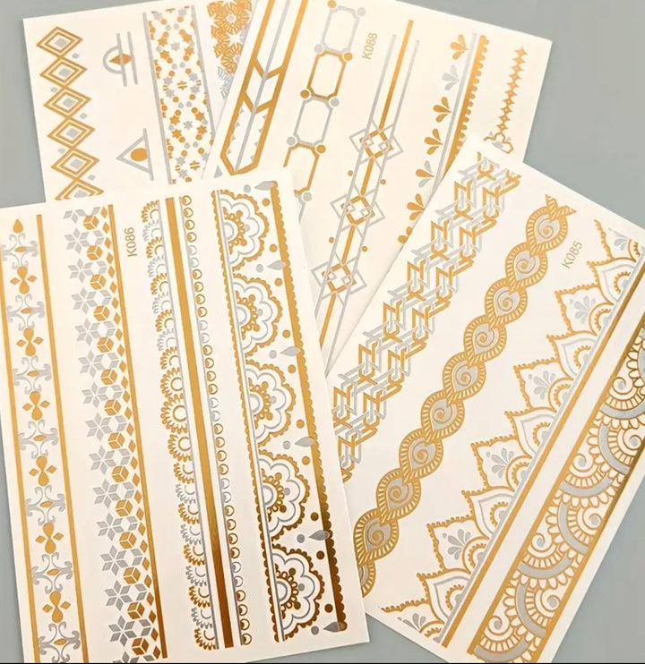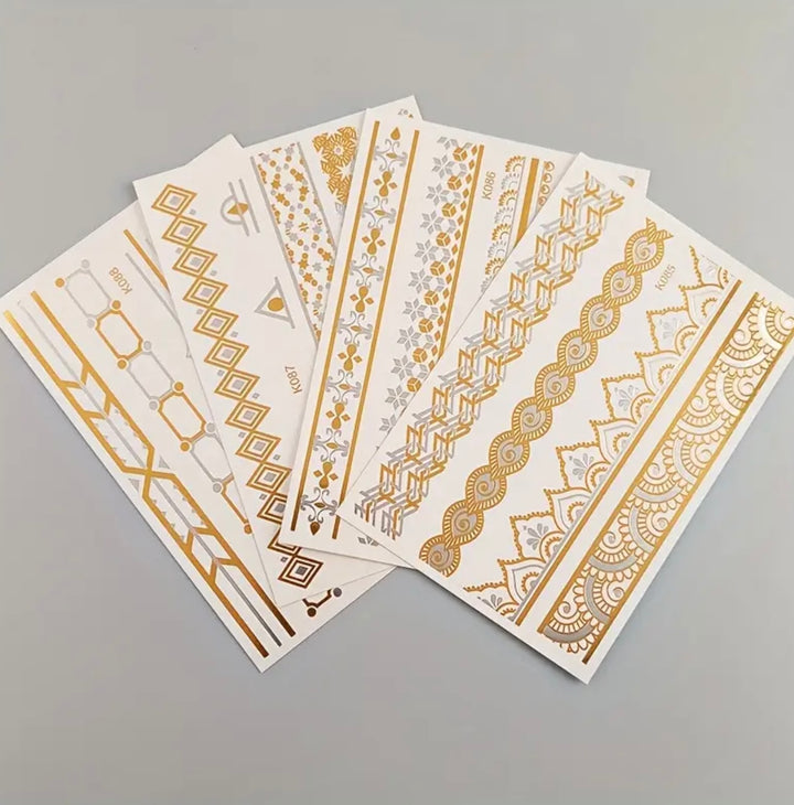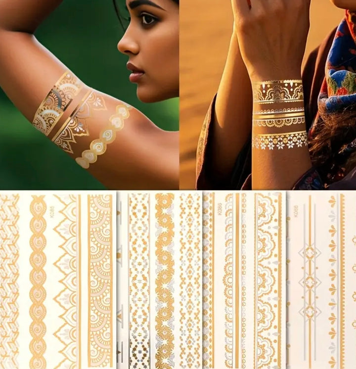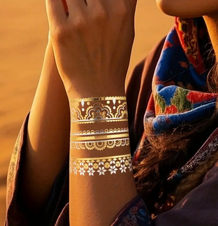 Dale un toque boho-chic y luminoso a tu piel con nuestros tatuajes temporales metalizados 💛.
