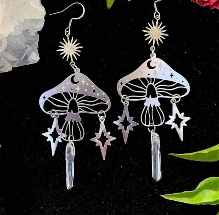 🍄Aretes colgantes en forma de hongo con detalles de luna y estrellas, acompañados de un cristal que aporta un aire místico y bohemio.