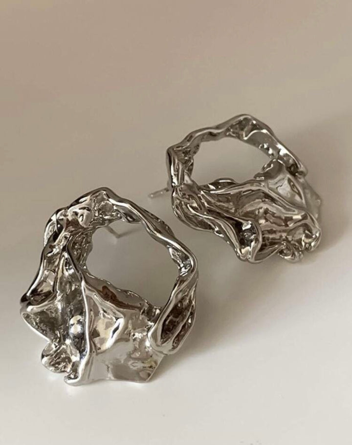 Con su acabado metálico y textura orgánica, estos aretes se convierten en una pieza única y artística, ideal para darle un toque moderno a cualquier look.