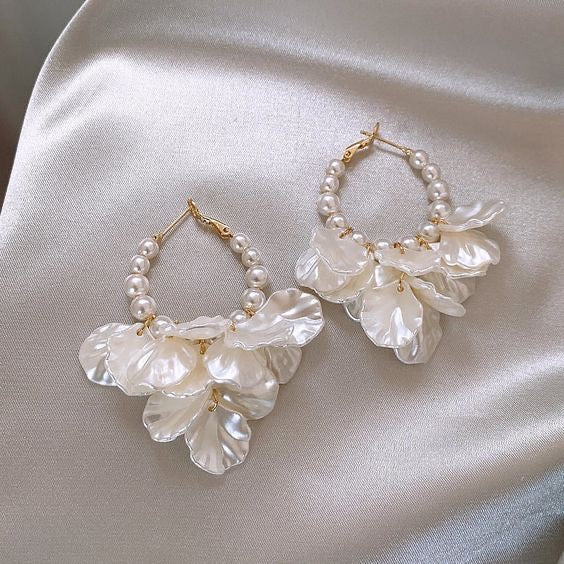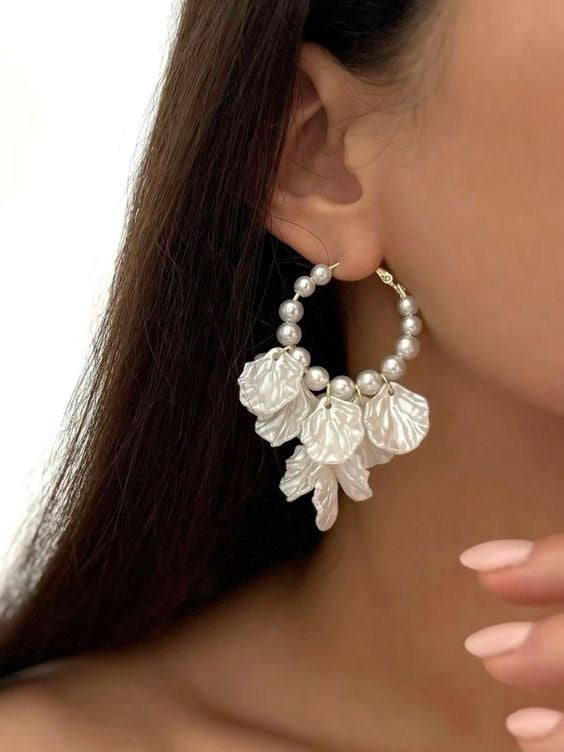El aro de perlas sostiene pétalos nacarados que caen con movimiento ligero y elegante, creando un accesorio perfecto para ocasiones especiales o para elevar un look romántico y femenino.