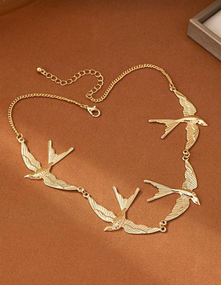 Cada ave dorada parece cobrar vida, creando un diseño que transmite ligereza y poder femenino.