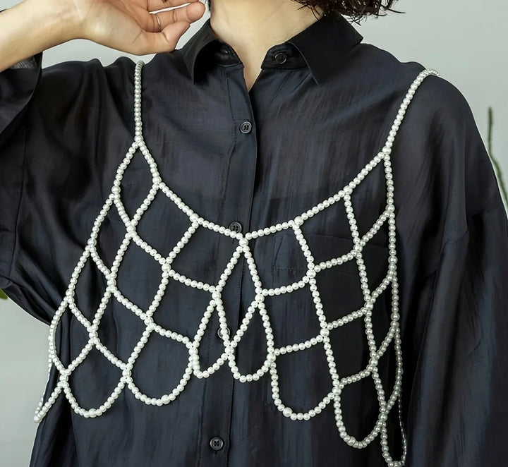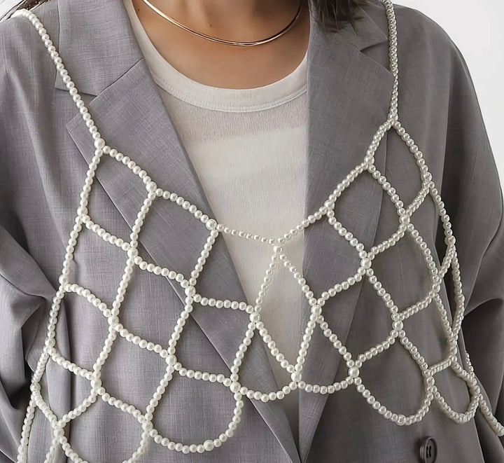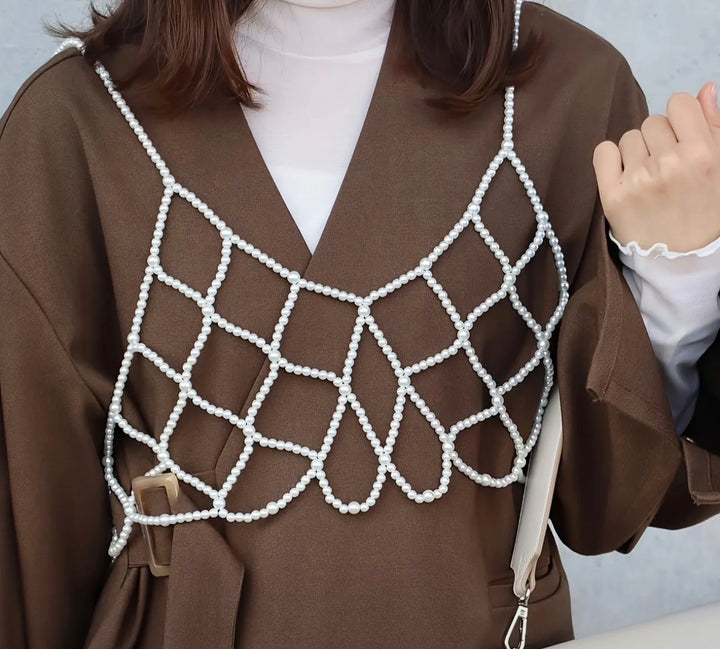 Dale un toque etéreo y delicado a cualquier outfit con este pearl mesh top, un accesorio tejido con perlas que forma una malla elegante y llena de movimiento.