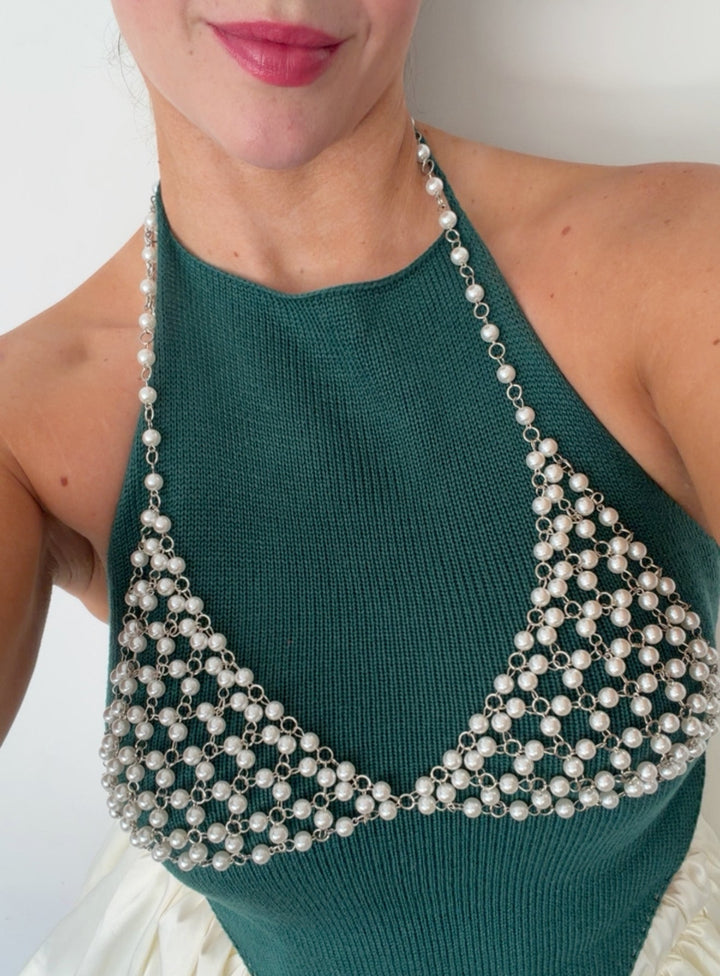 Dale un toque etéreo y delicado a cualquier outfit con este pearl mesh top, un accesorio tejido con perlas que forma una malla elegante y llena de movimiento.