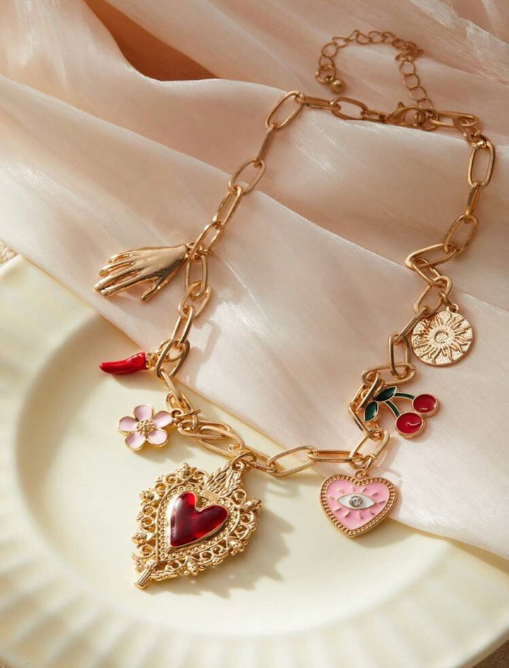 ✨El corazón sagrado como protagonista, acompañado de amuletos de buena suerte como el ojo, la mano y el sol, se mezcla con detalles coquetos como las cerezas y la flor.