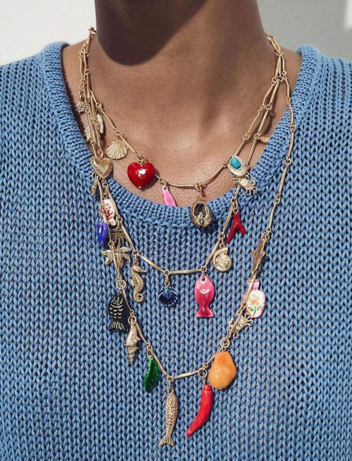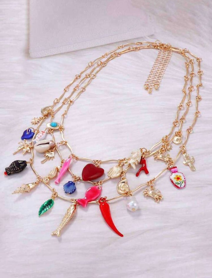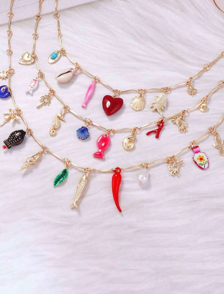 Este collar está diseñado con una cadena dorada y una explosión de dijes únicos: corazones, conchas, peces, amuletos y detalles vibrantes que cuentan historias y atraen miradas.