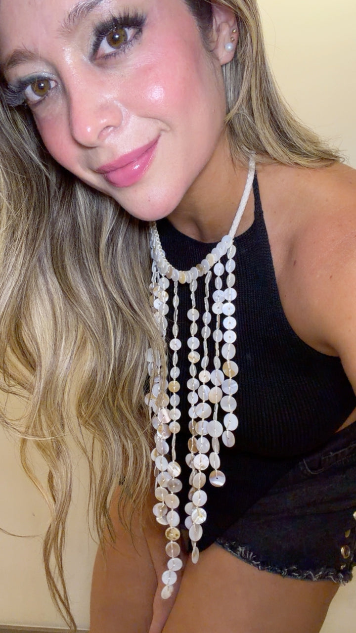 Un accesorio que roba miradas desde el primer segundo. Este collar tipo gargantilla está elaborado con hebras de discos madreperla brillantes que caen en forma de cascada, creando un efecto luminoso y elegante en cada movimiento.
