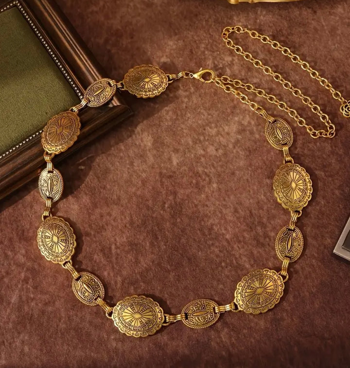 ✨Diseñado con medallones dorados grabados y una delicada cadena ajustable, es perfecto para usar sobre vestidos, faldas o trajes de baño.