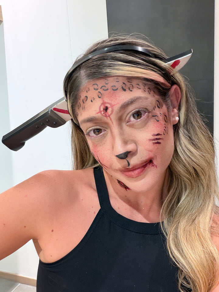 ¡El accesorio más divertido (y sangriento) de la temporada! 💋 Esta diadema simula un cuchillo atravesando la cabeza y le da a tu disfraz un toque loco y original sin perder el estilo.