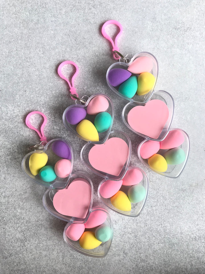 Estos mini beauty blenders vienen en un empaque en forma de corazón súper cute 💕 con llavero incluido, perfectos para llevarlos siempre contigo.