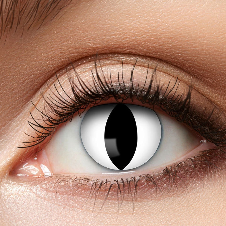 Su diseño con pupila vertical en negro sobre fondo blanco crea un efecto reptiliano y cautivador, ideal para disfraces de gato, demonio, serpiente o cualquier personaje fantástico. 🖤✨