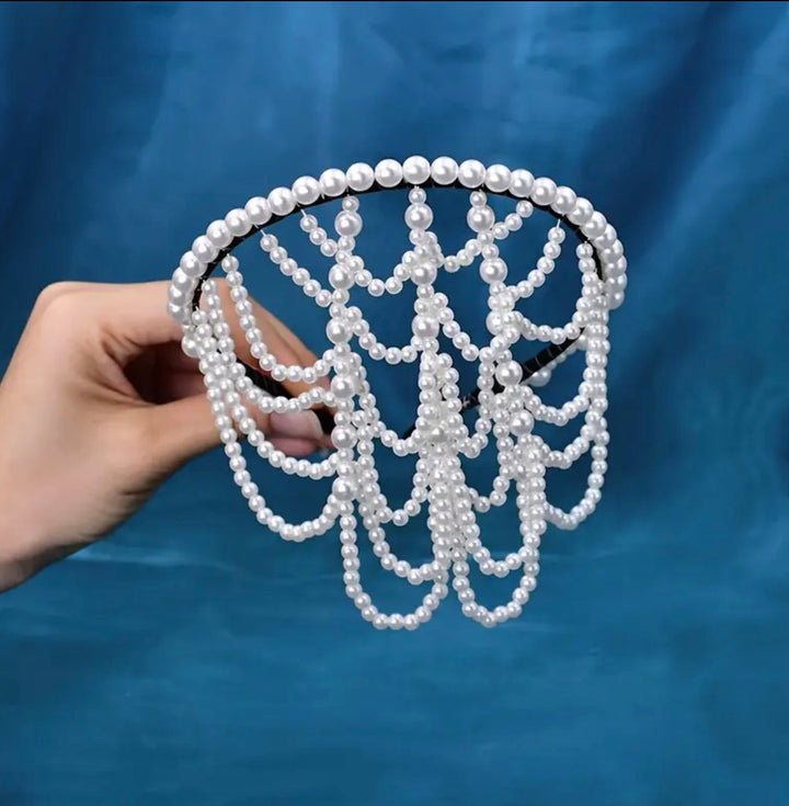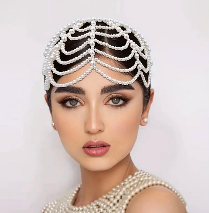 Deslumbra con este tocado de perlas estilo red, una pieza elegante y sofisticada que combina glamour y delicadeza.