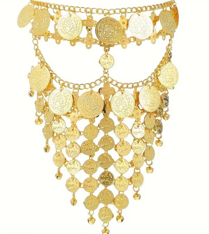 Deslumbra con este velo facial adornado con delicadas monedas doradas, una pieza súper elegante que mezcla misterio, brillo y sofisticación.